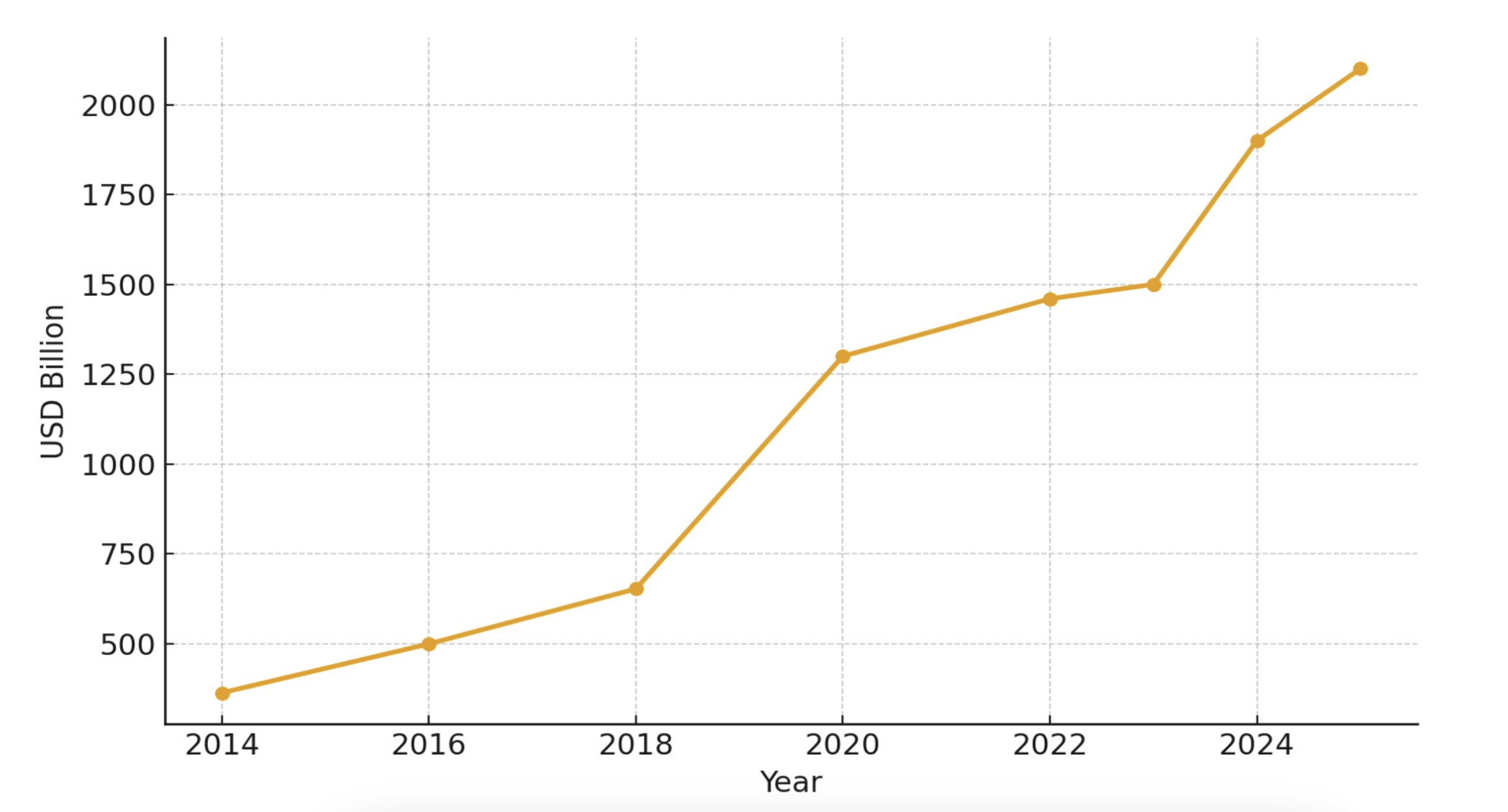Another notable trend is the rapid growth of green and sustainable debt markets. The Climate Bonds Initiative (CBI) reports that cumulative issuance of green, social, sustainability, and sustainability-linked (GSS+) bonds surpassed USD 5.4 trillion by the third quarter of 2024, with about USD 671 billion in aligned green bonds issued in 2024 alone (CBI, 2024). Countries such as Chile and Uruguay have pioneered sovereign sustainability-linked bonds, tying repayment terms to climate performance indicators is a practice now being emulated by other governments.